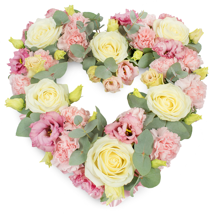 Express your enduring love and remembrance with our Timeless Sympathy Open Heart Bouquet. This exquisite arrangement features a captivating mix of white roses, pink carnations, pink lisianthus, and lush Eucalyptus leaves, artistically arranged in an open heart shape to symbolize everlasting affection.